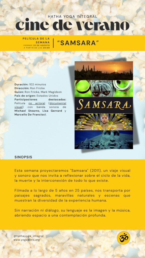 Esta semana proyectaremos «Samsara» (2011), un viaje visual y sonoro que nos invita a reflexionar sobre el ciclo de la vida, la muerte y la interconexión de todo lo que existe. Filmada a lo largo de 5 años en 25 países, nos transporta por paisajes sagrados, maravillas naturales y escenas que muestran la diversidad de la experiencia humana.